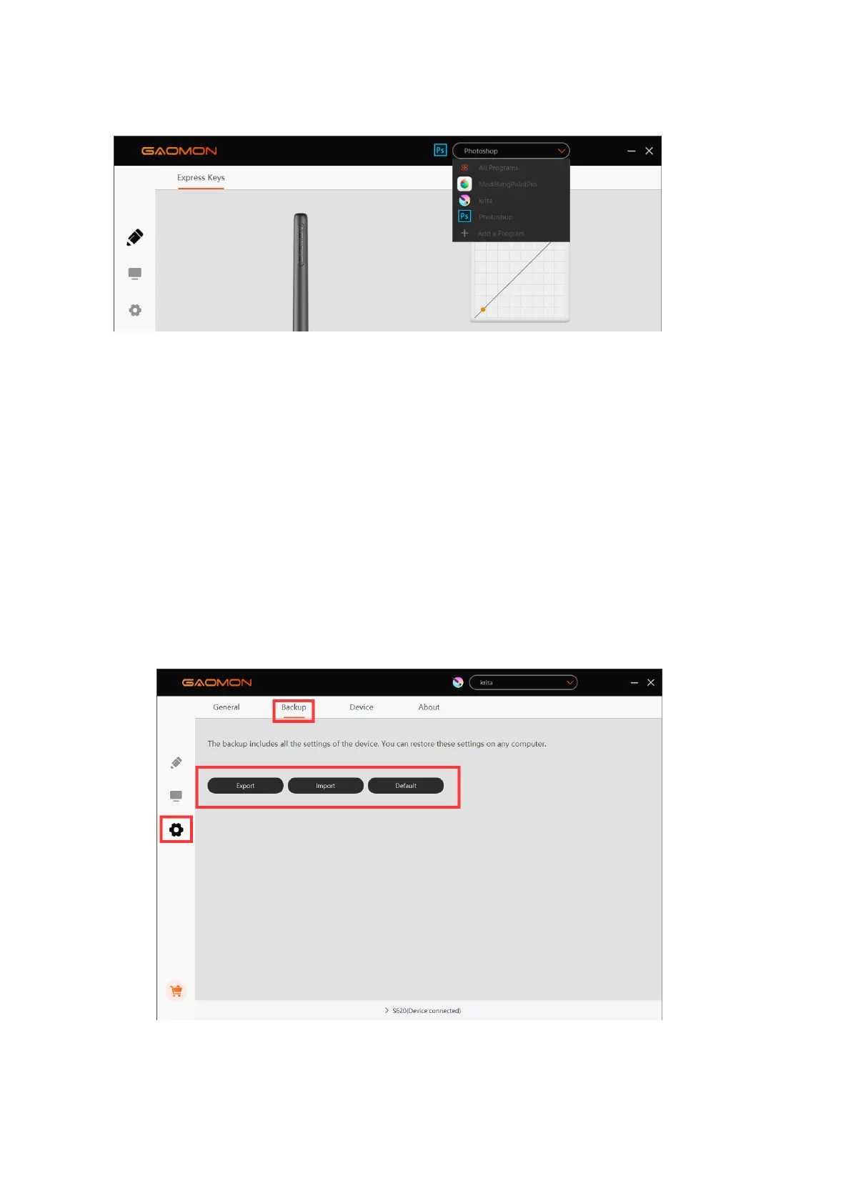 In the “Settings” interface of GAOMON driver, there are three buttons: 'Export', 'Import' and