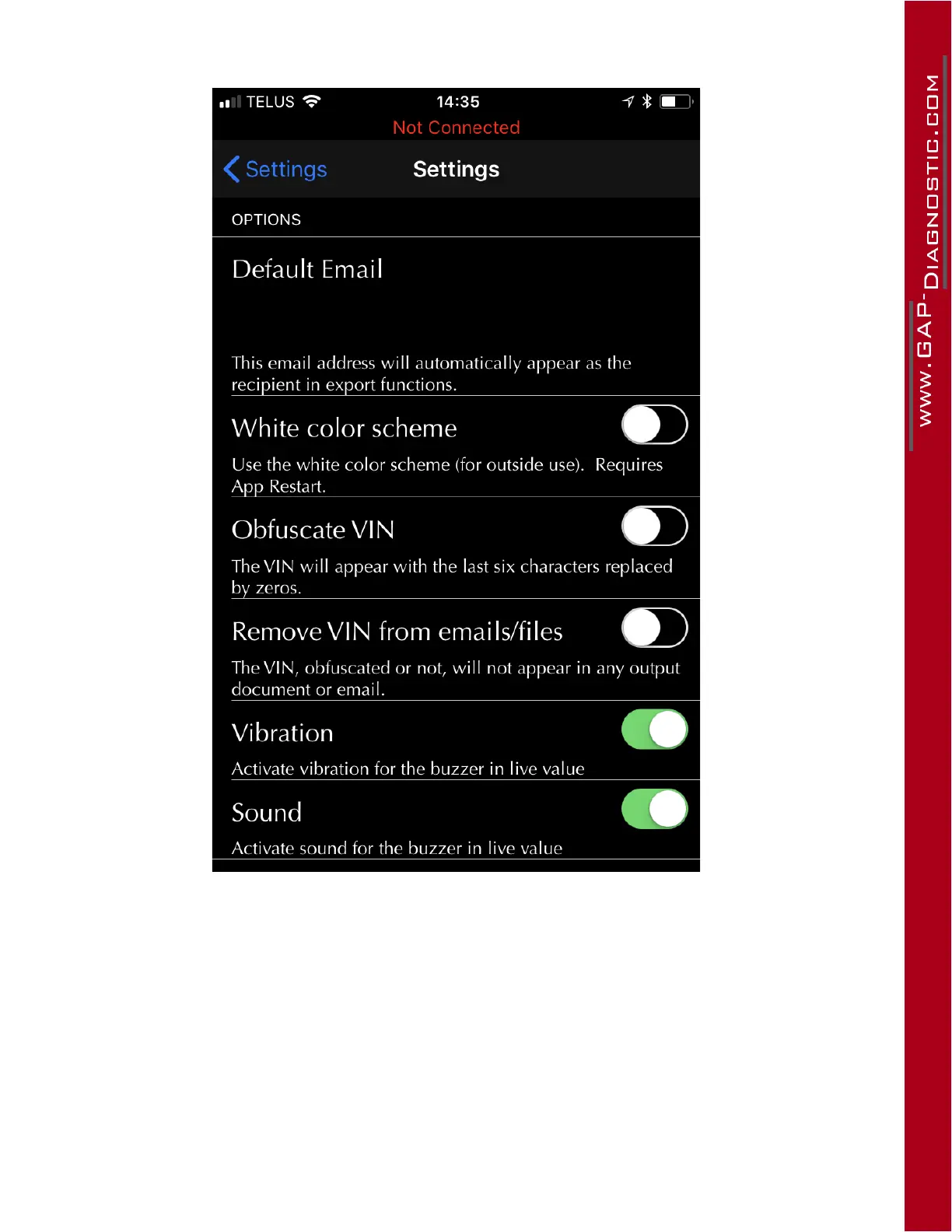 Gap Diagnostic IIDTool BT - Available Settings and Description