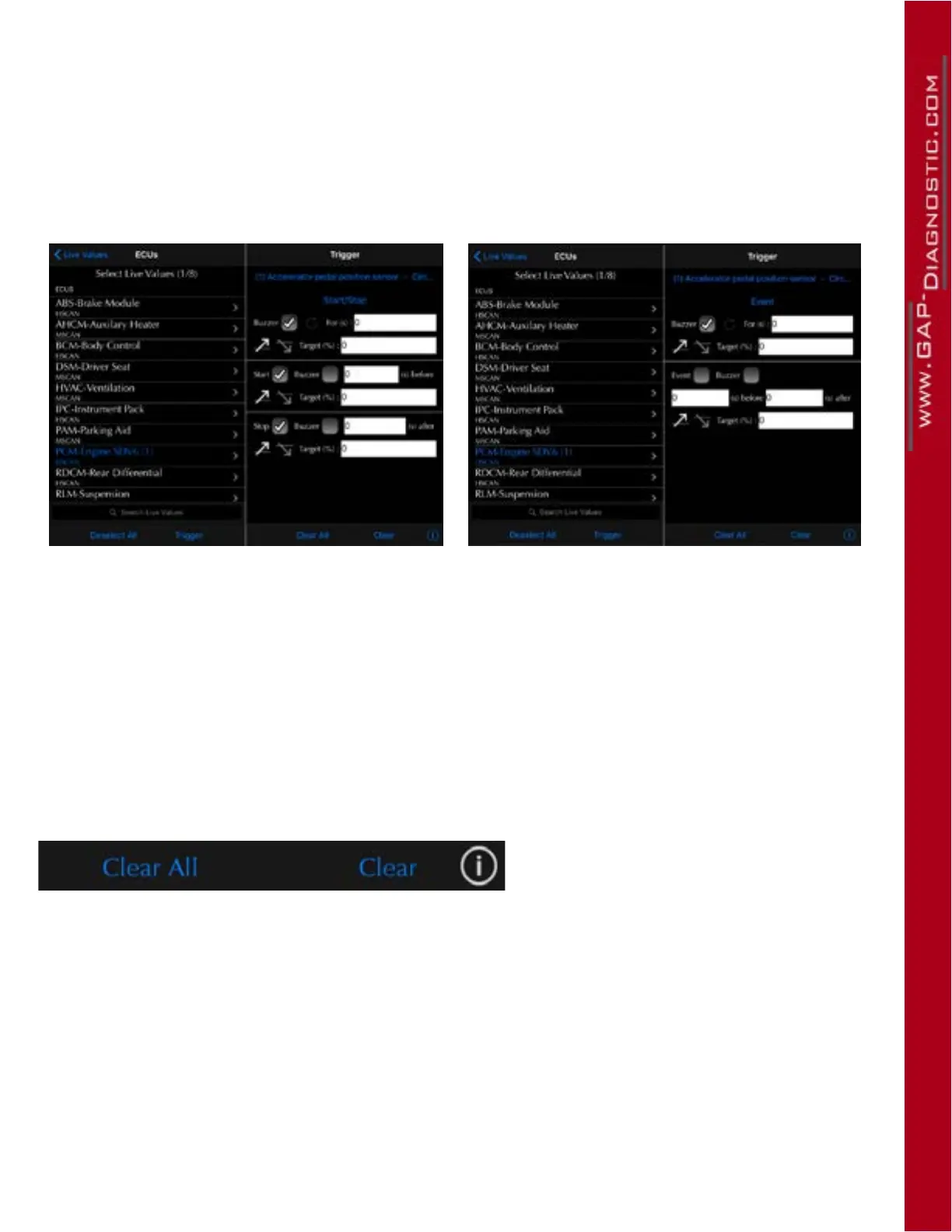 This feature allows automatic controlling of live data recording, start and stop, by comparing live values