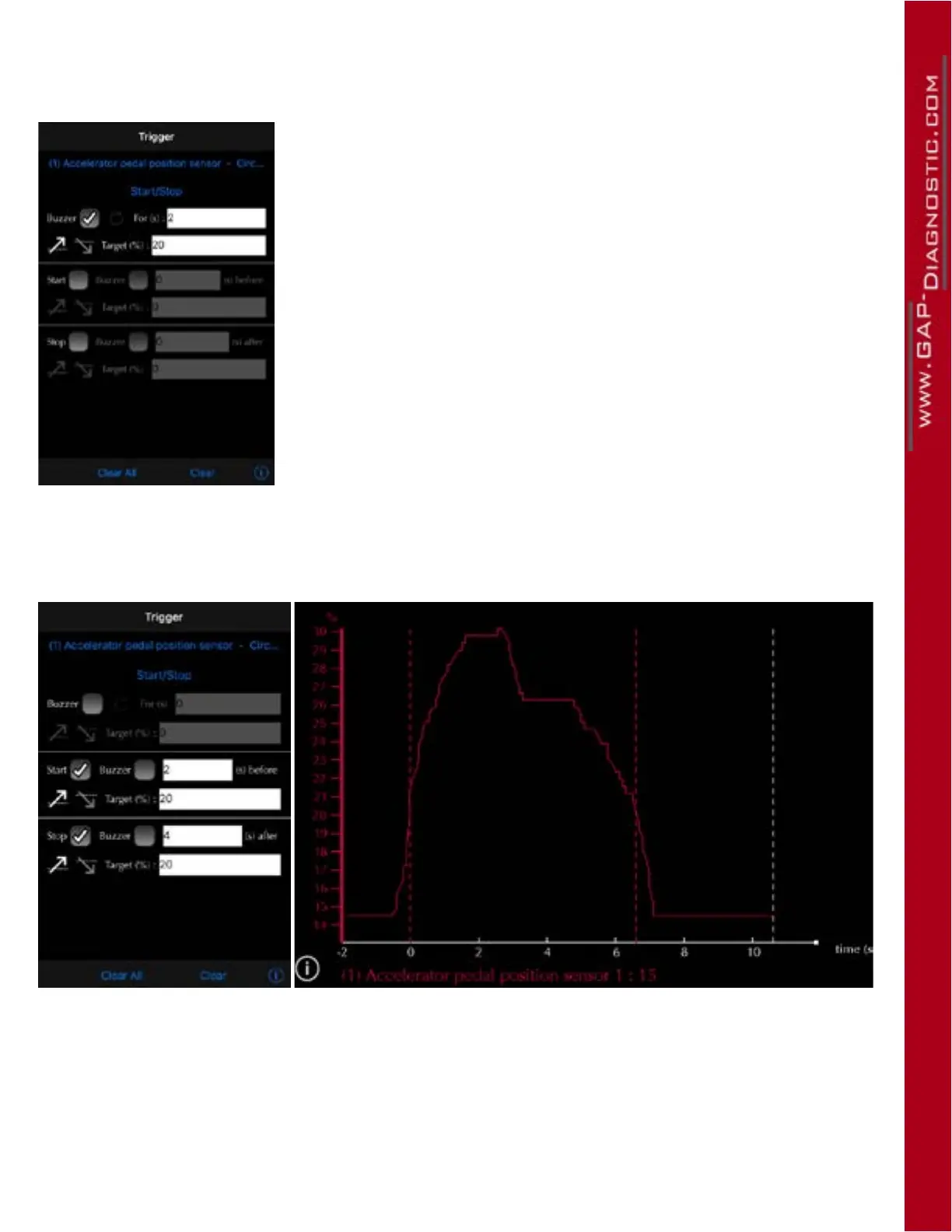 • The Stop condition is met at around 6.5 seconds, hence the trigger indicator (red dotted lines).
