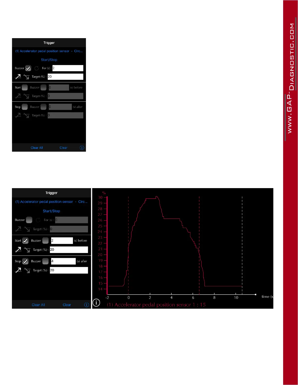• The Stop condition is met at around 6.5 seconds, hence the trigger indicator (red dotted lines).