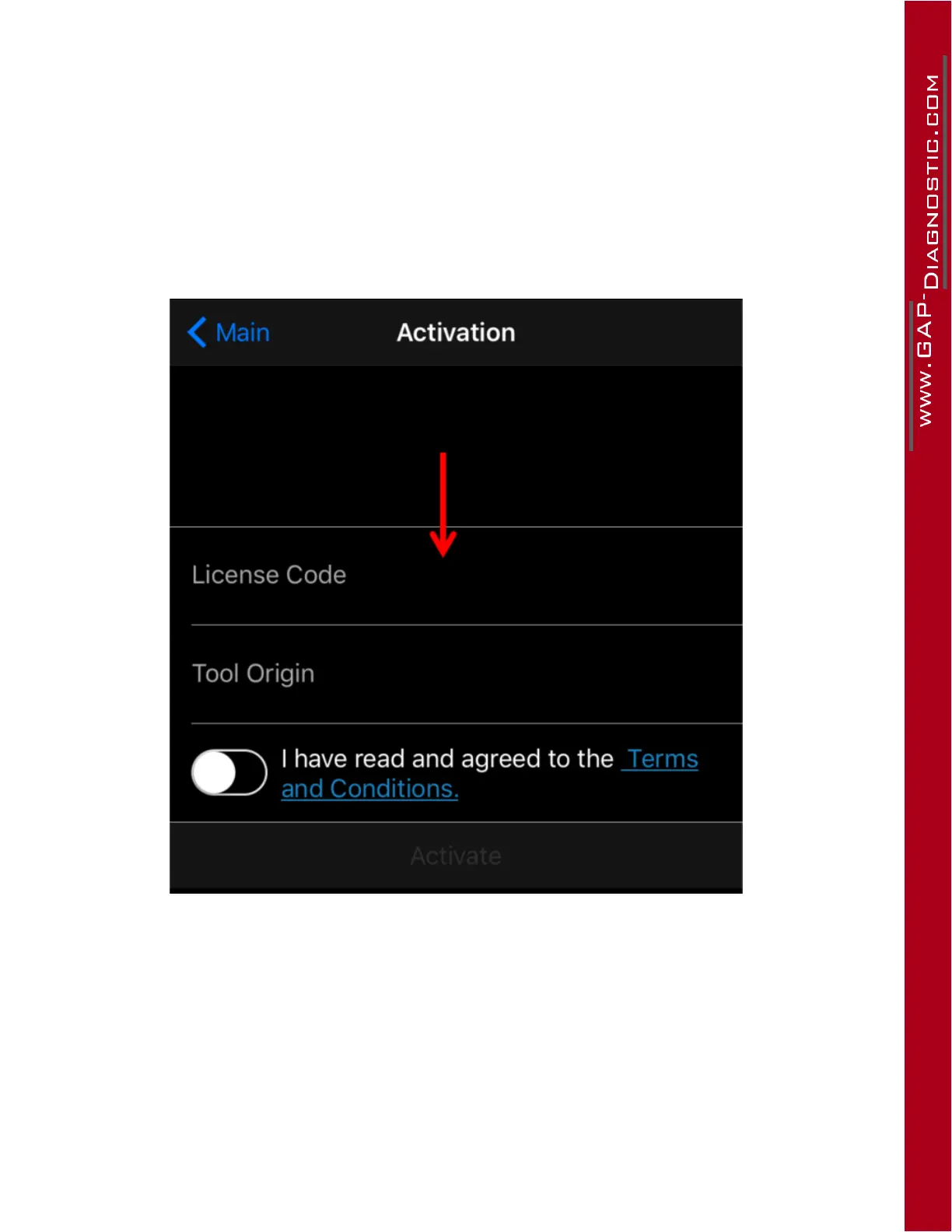 4- Enter the licence code (red arrow), select tool origin, read and agree to the terms and conditions
