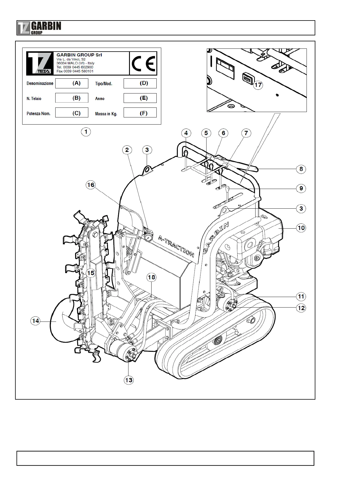 track (one left and one right)- 13) Hydraulic motor controlling the chains . - 14) Screw for moving material. - 15)