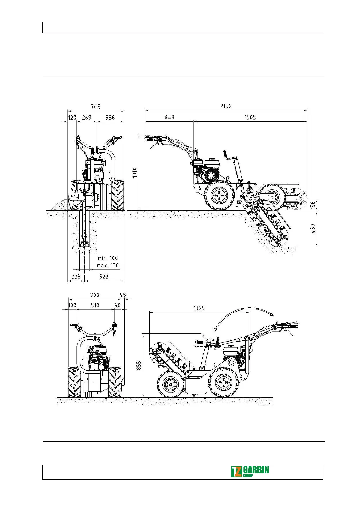 FIG. 5 shows the overall dimensions of the machine and of the possible trenching depths