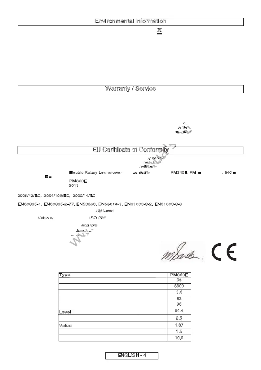 Designation........................Electric Rotary Lawnmower represented by the code PM340E, PM = Powermax, 340 =