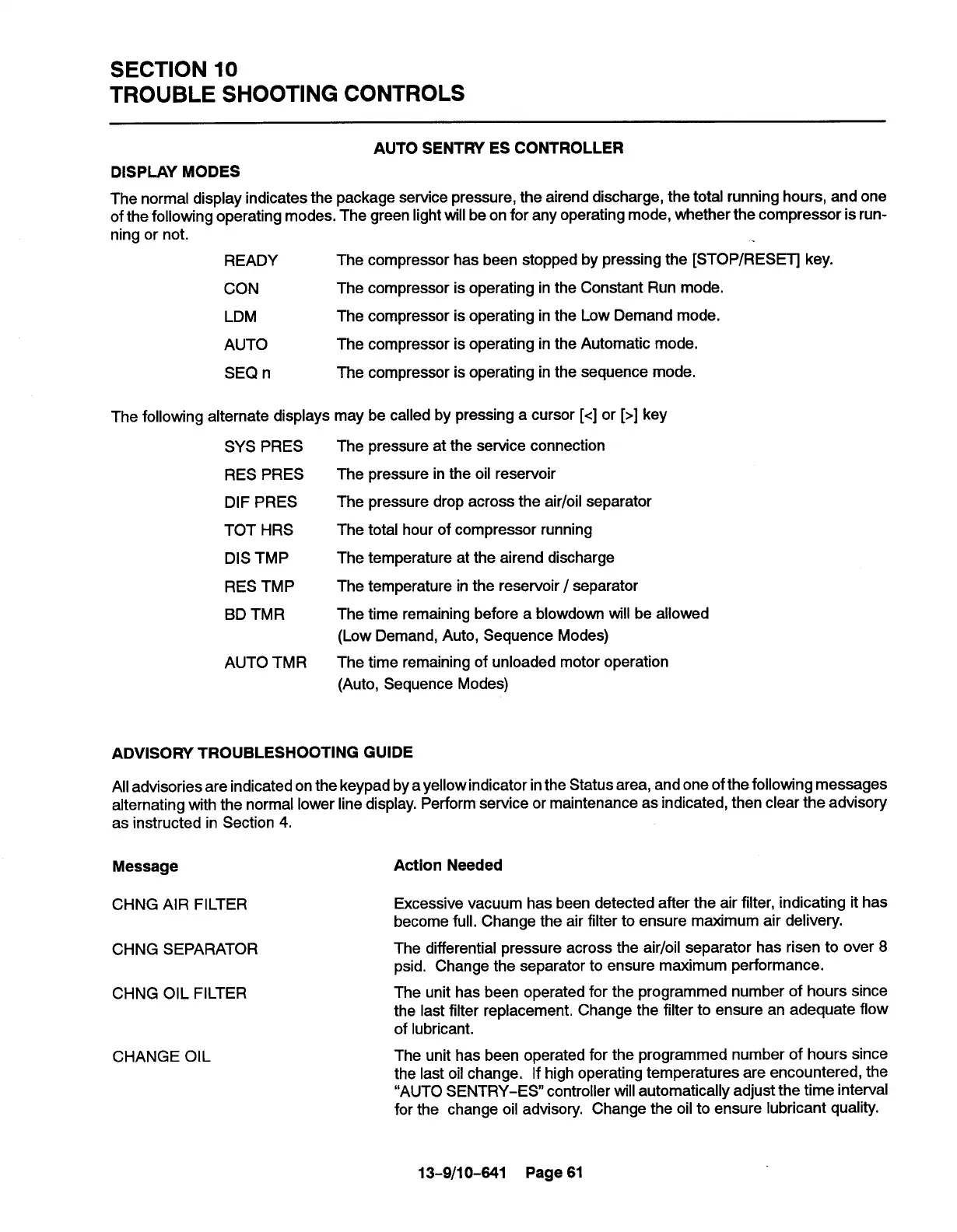 alternating with the normal lower line display. Perform service or maintenance as indicated, then clear the advisory