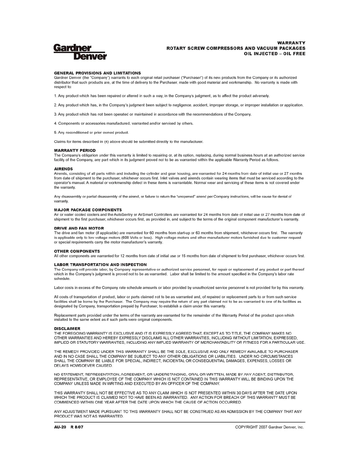 Gardner Denver INTEGRA EFD99E - Warranty Information; General Provisions and Limitations; Warranty Period; Disclaimer