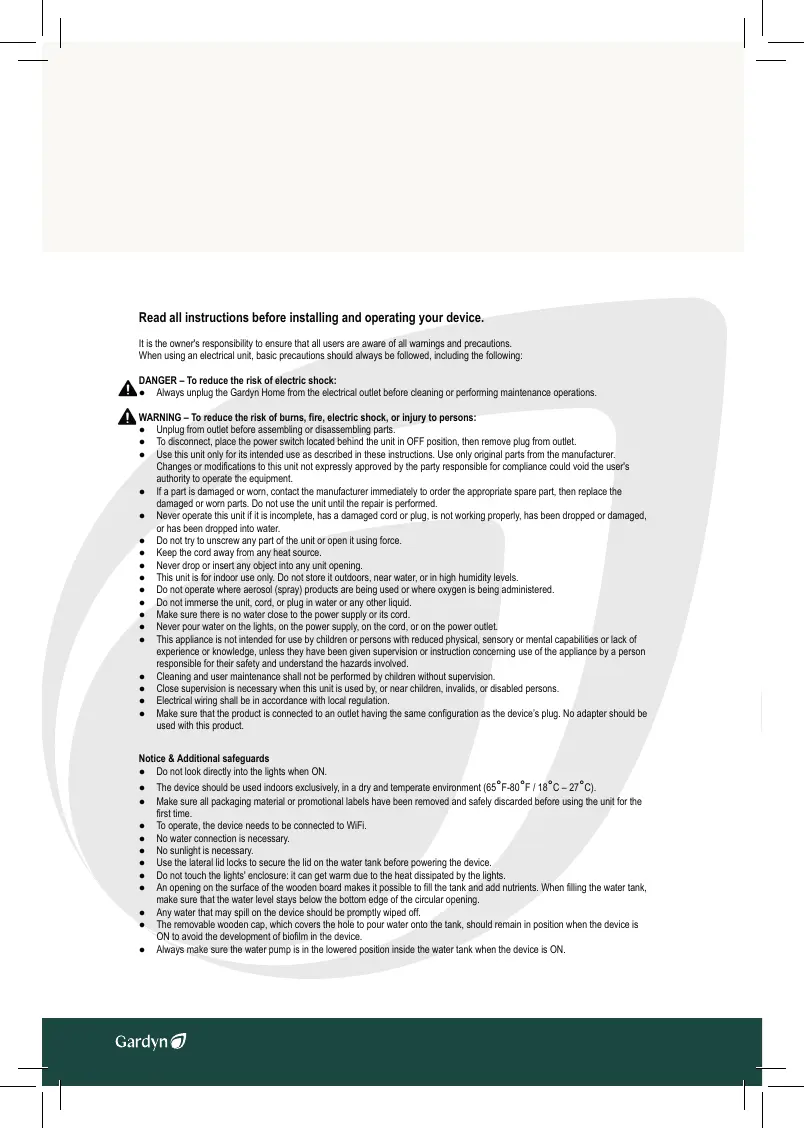 ● Always unplug the Gardyn Home from the electrical outlet before cleaning or