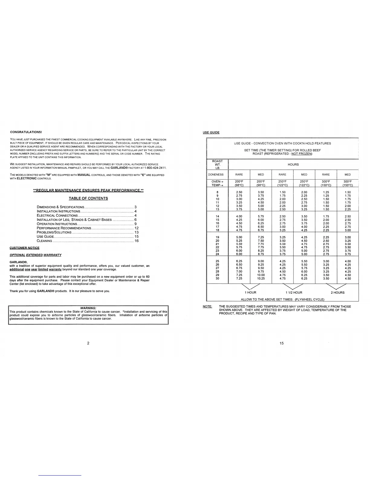 Garland ECO-E-10-E - Rolled Beef Roast Guide; Roasting Times and Temperatures