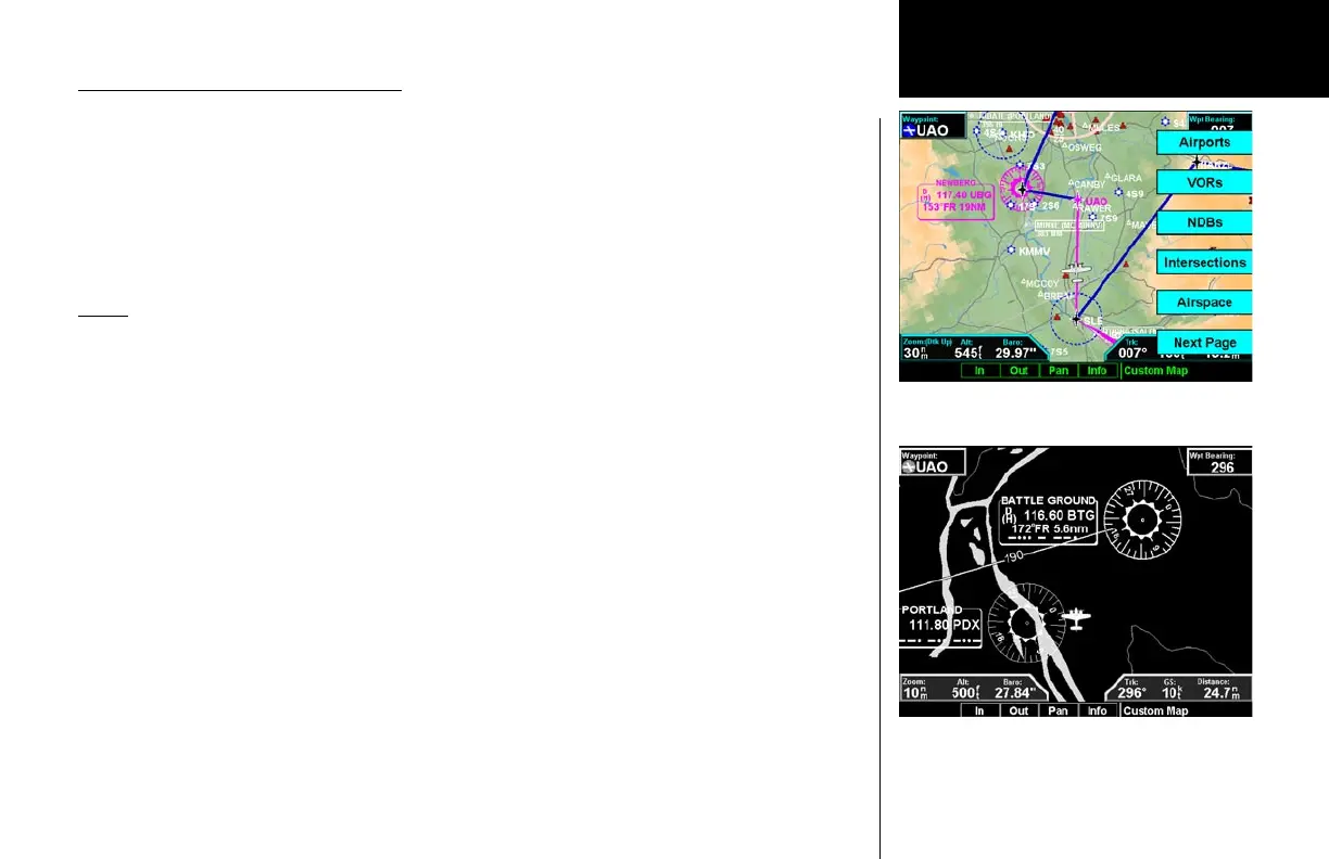 You can turn the display of VOR and ILS information in the Custom Map page on or off. VOR and ILS infor-