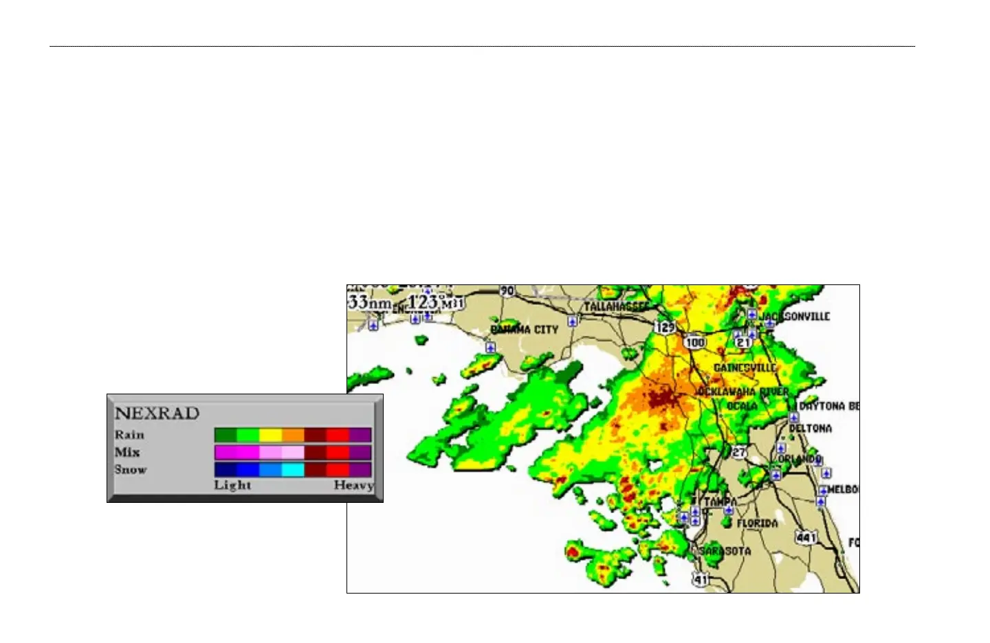 A legend showing the colors for Rain, Mix, and Snow can be displayed by pressing the ADJ key and selecting Weather Legend. NEXRAD can be
