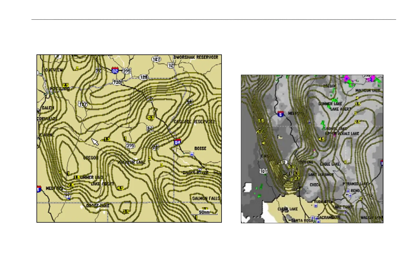 Visibility is the maximum horizontal distance that can be seen. Isobars on the Visibility feature show a change in visibility. In the example below, visibility ranges from