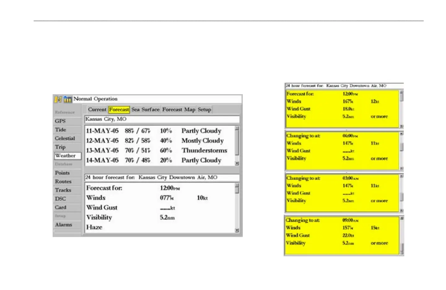 from the responding weather service center. If more than four days of forecasts appear, use the ROCKER to move down the list.