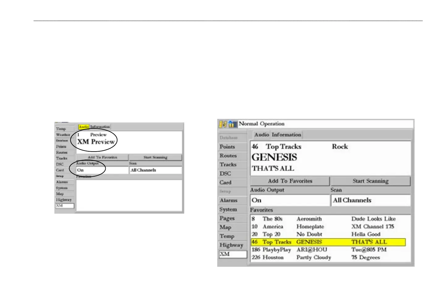 The Audio sub tab provides access to the XM Radio feature. From this tab stations can be scanned, selected and added to a Favorites List and the Audio Output can