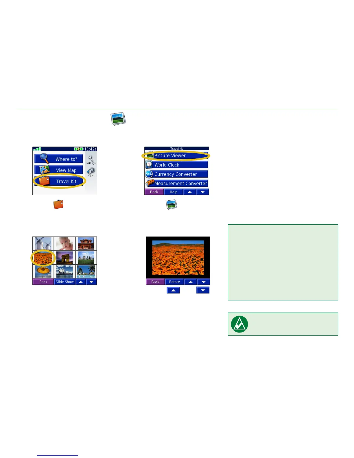 You can view pictures that you have stored in your nüvi using the Picture Viewer.