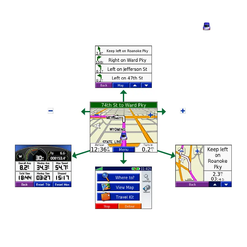 From the Menu page, touch View map to open the Map page. The position icon shows