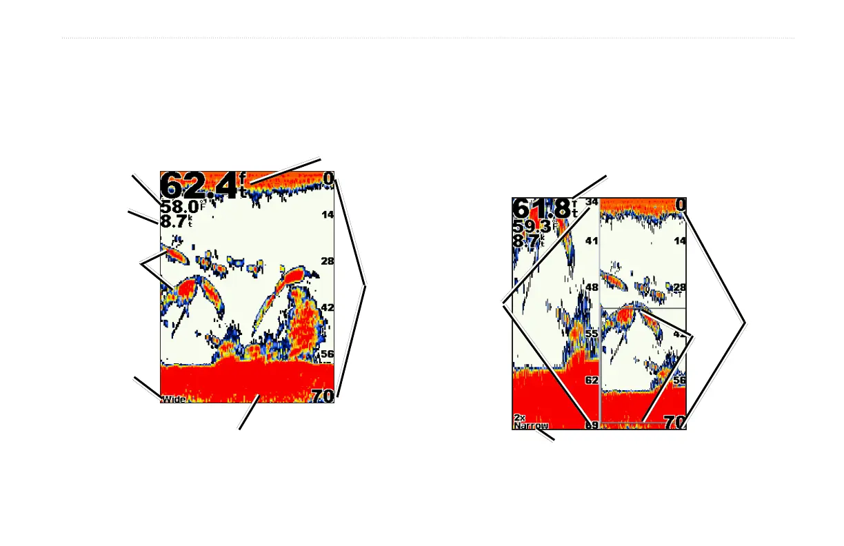 Use the Split Zoom screen to view the full sonar data from the graph