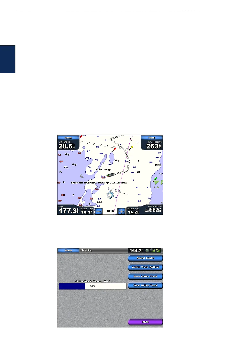 From the Navigation chart, touch Menu > Chart Setup > Tracks > On. A trailing line on the chart