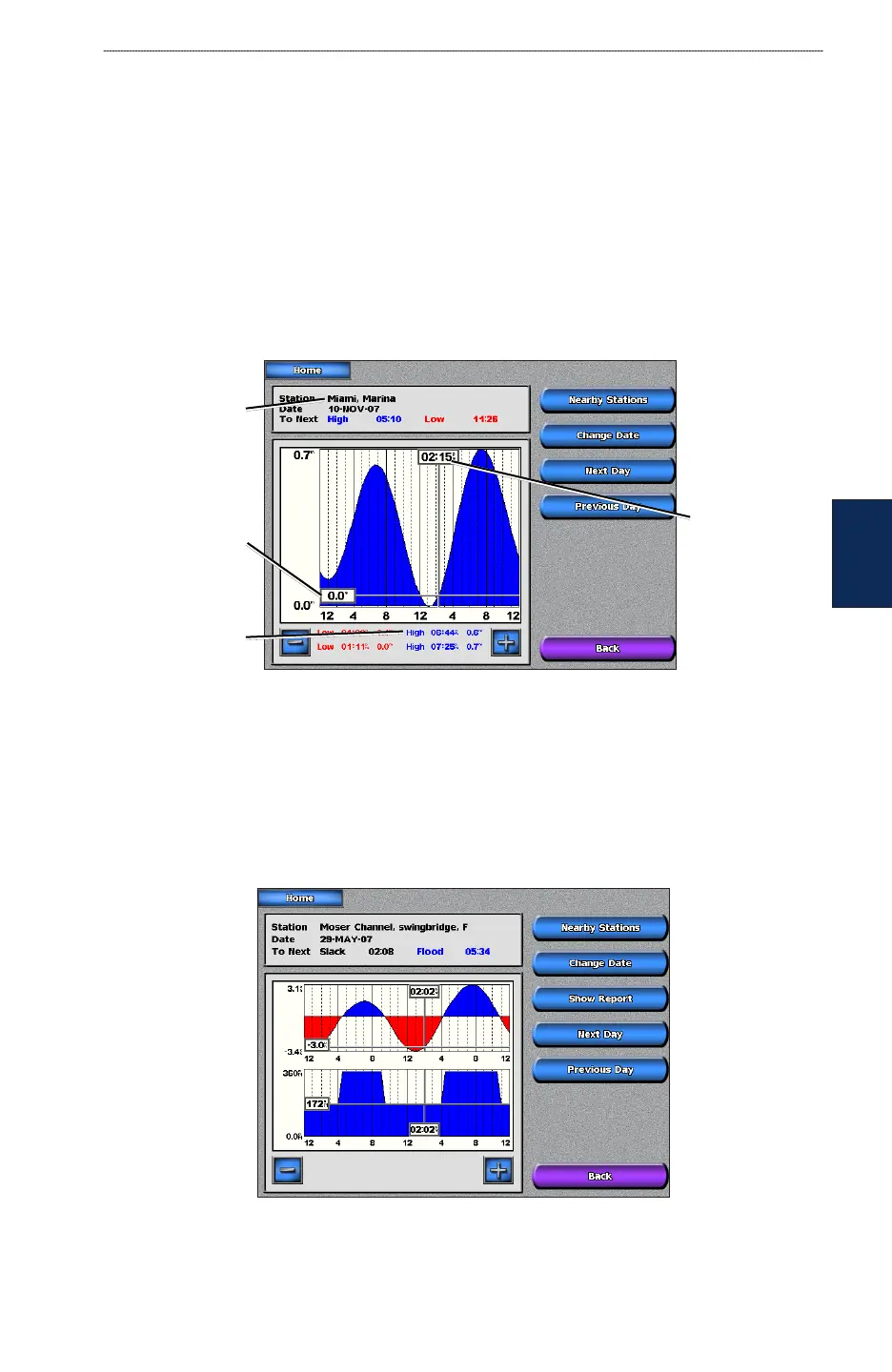 To view tide information from the Home screen, touch Information > Tides. Information for the