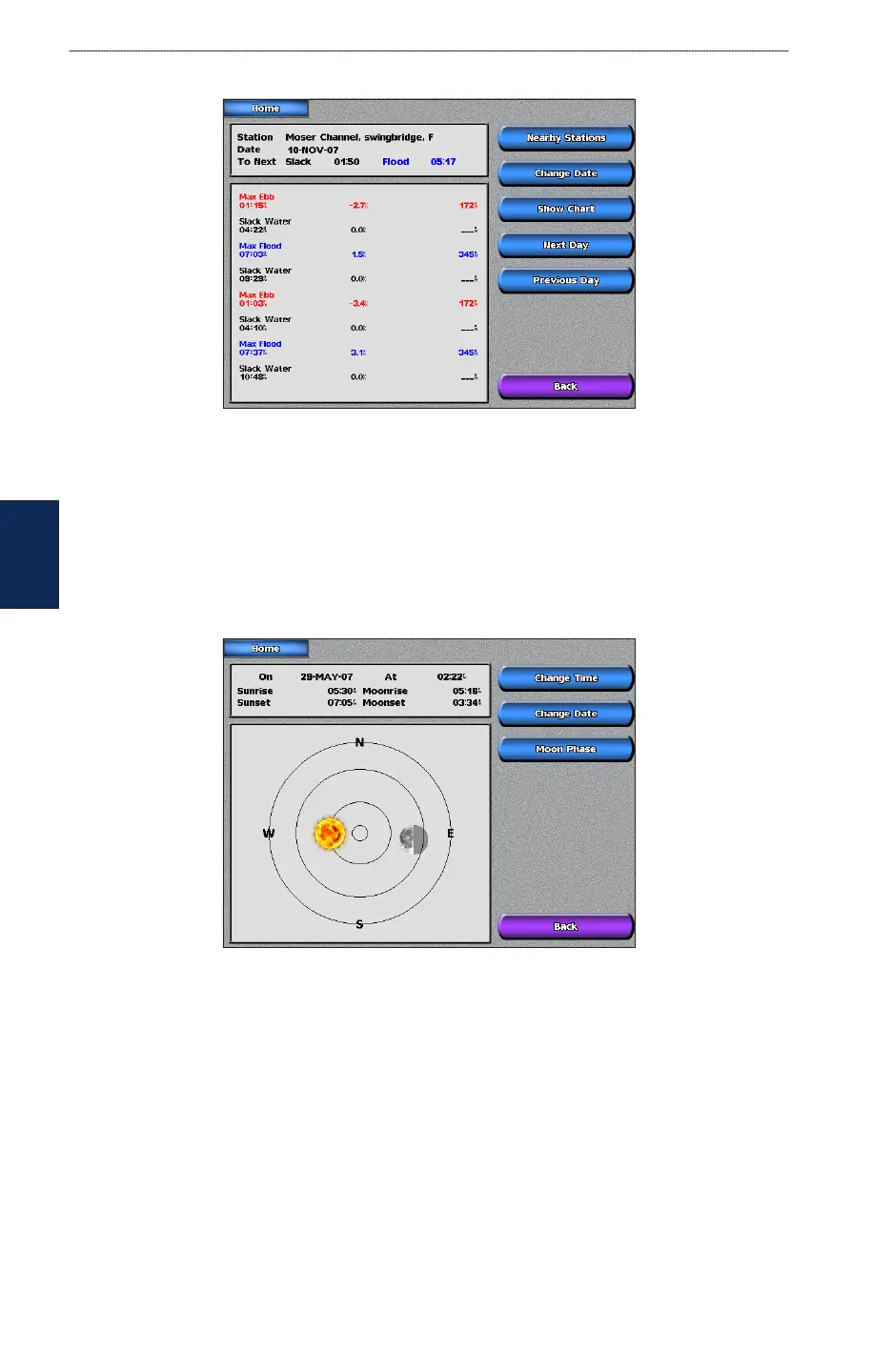 Use the Celestial screen to view celestial data for sunrise, sunset, moonrise, moonset, moon phase,
