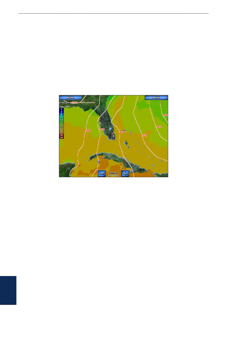 The Water Temperature feature indicates the water’s surface temperature, as indicated by the legend