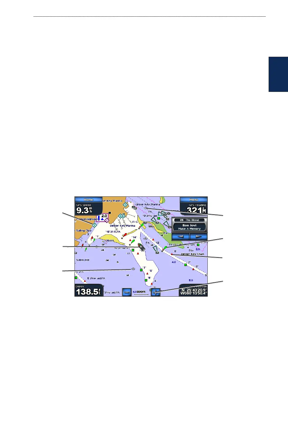 Navigation Chart—displays navigation data available on your preloaded maps, including buoys,