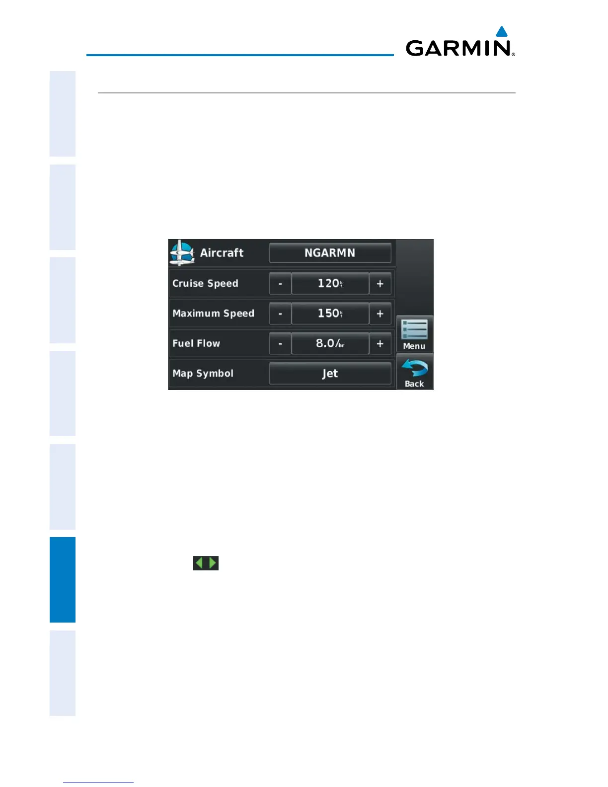 Enter the Cruise Speed, Maximum Speed, or Fuel Flow using the +/-