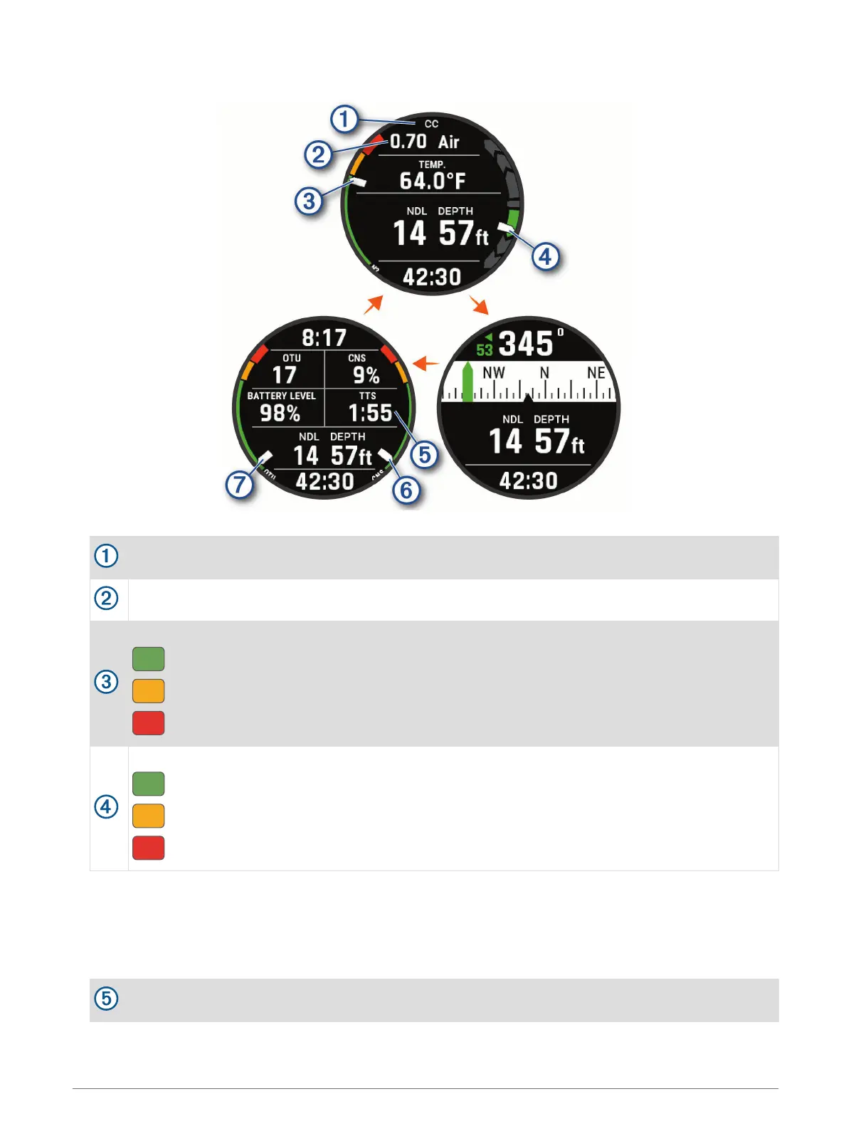 Primary data screen: Displays the main dive data, including your breathing gas and rate of ascent or decent.