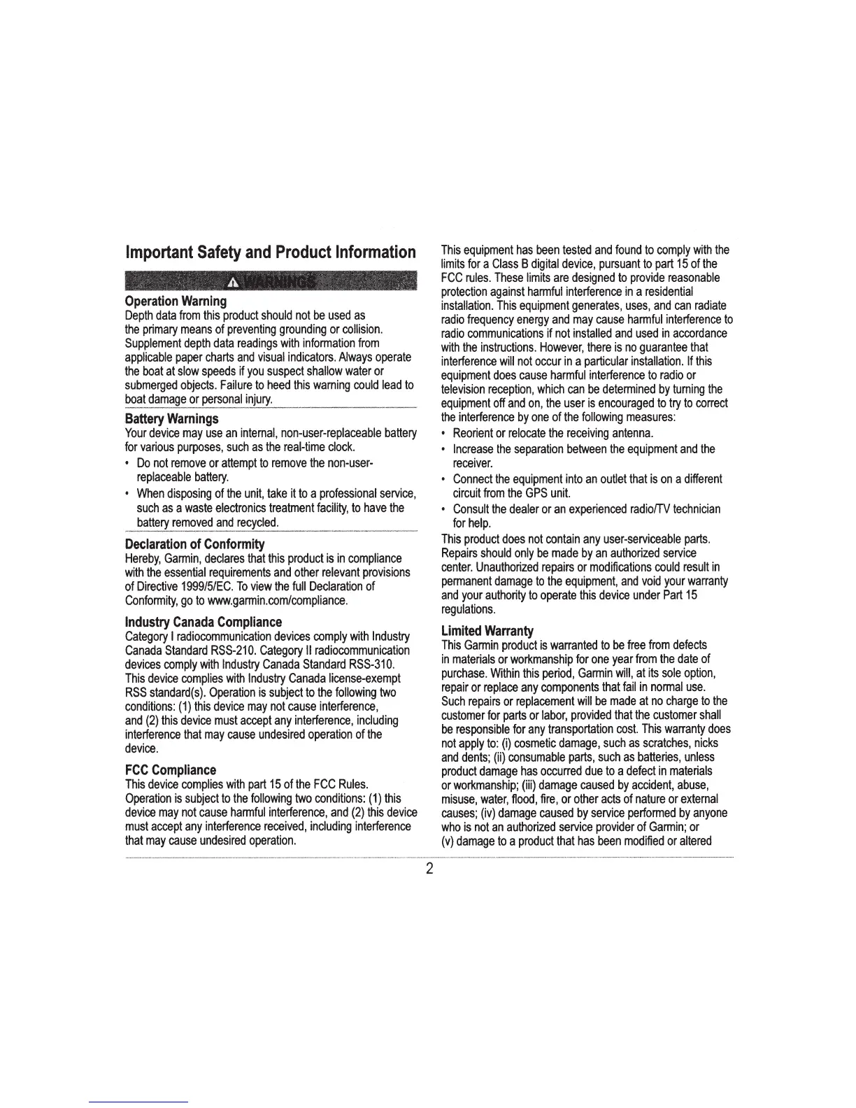 Garmin Echo 150 - Important Safety and Product Information; Operation and Battery Warnings