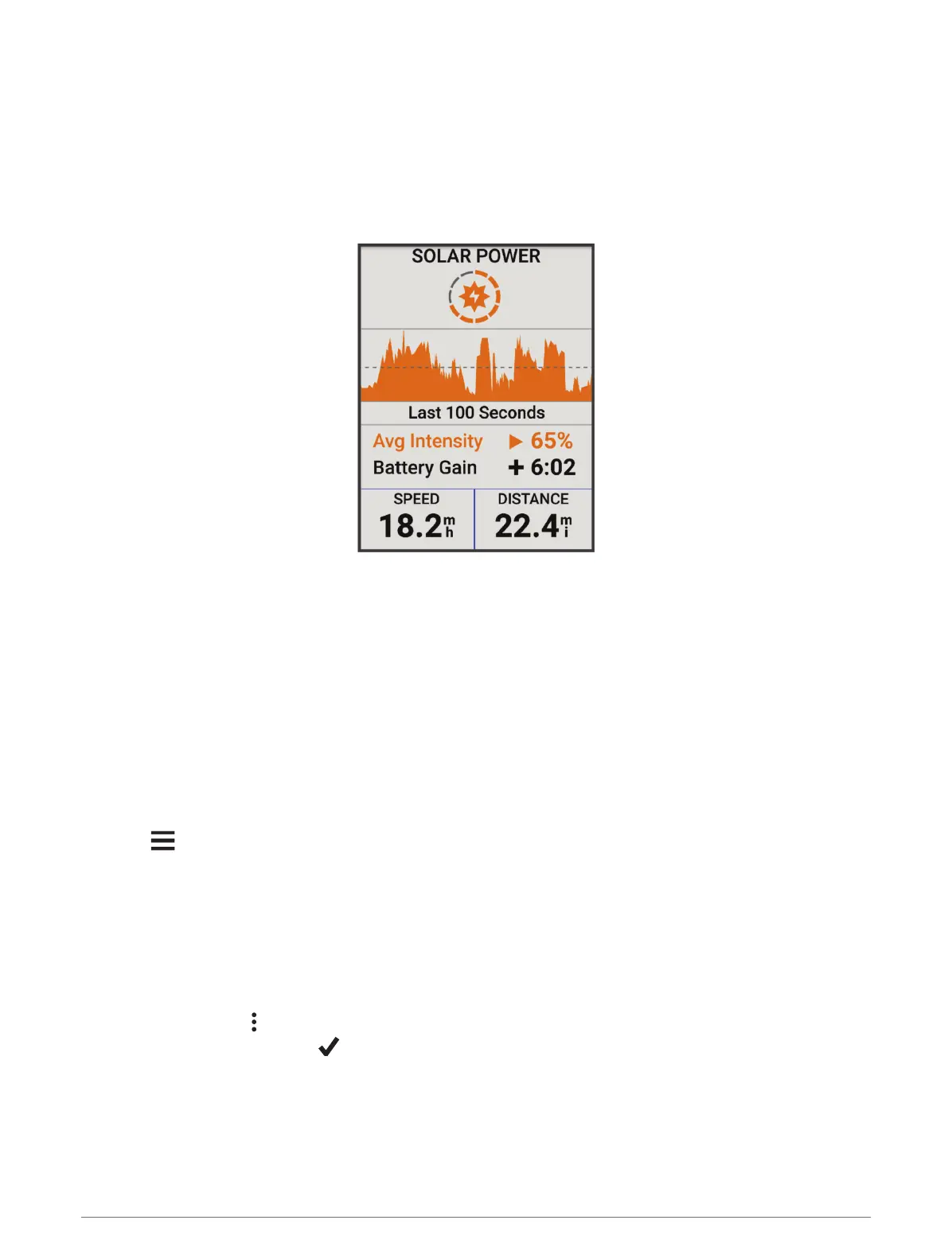 The solar data page highlights the intensity of the current light conditions and the accumulated ride time