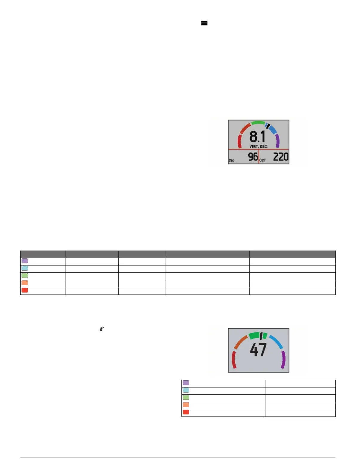 The running dynamics screen displays a color gauge for the primary metric. You can display cadence, vertical oscillation, or ground