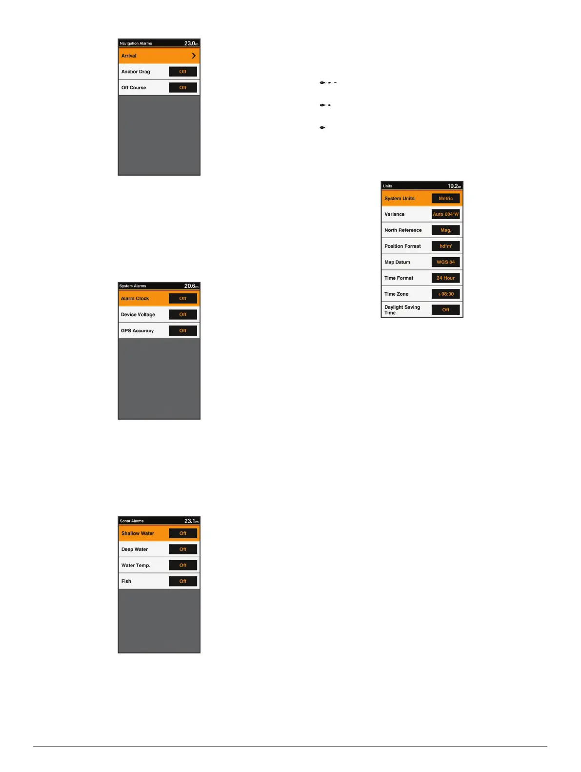 Select Settings > Alarms > Sonar.