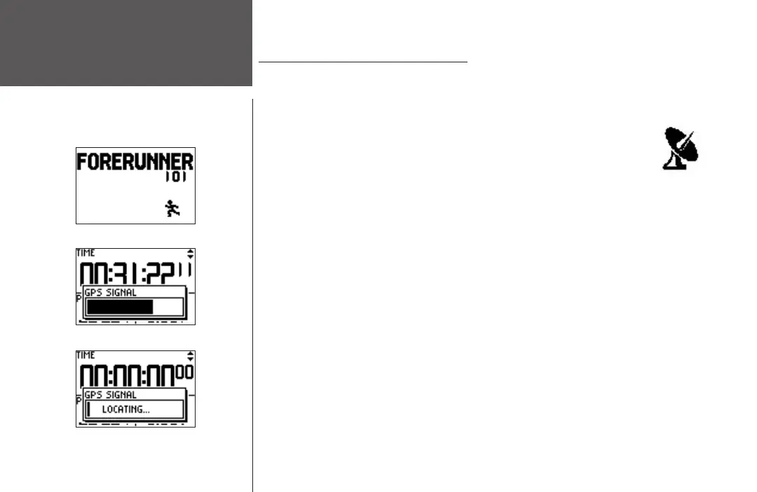 receiving satellites the first time you use the Forerunner.) The word “Locating..” appears in