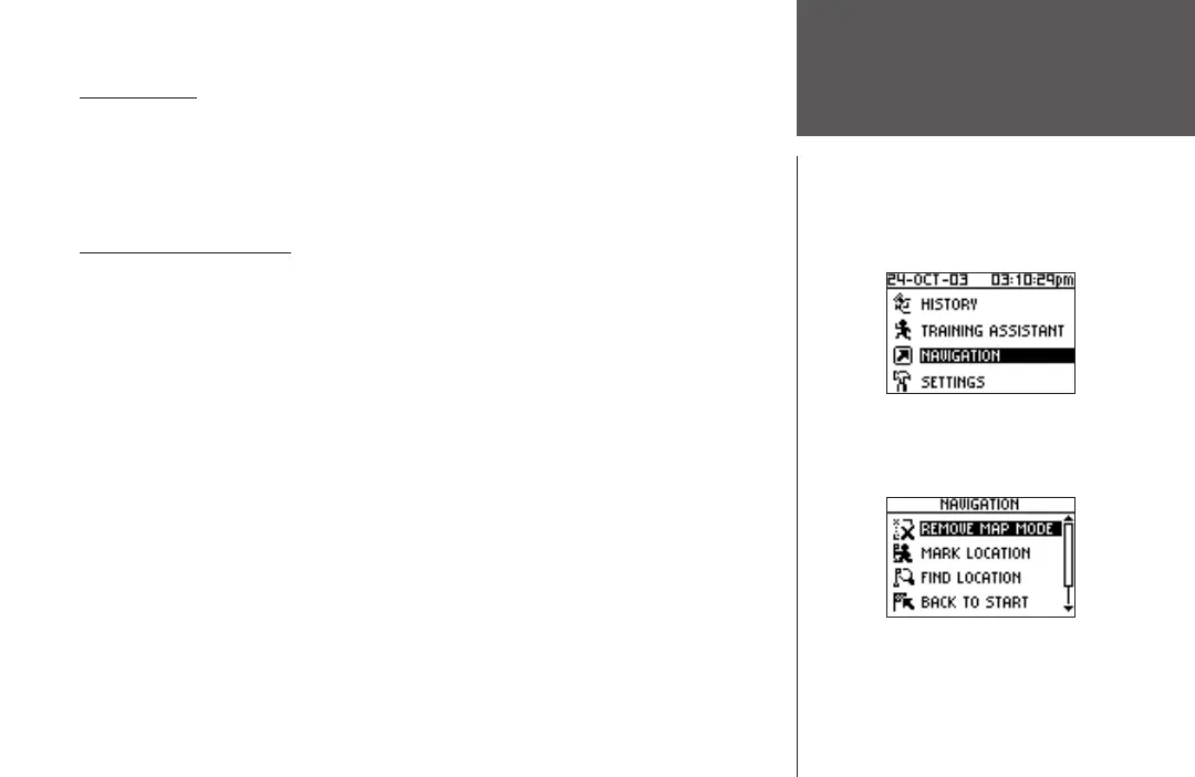 The Navigation Menu provides additional options for traveling with your Forerunner 101.
