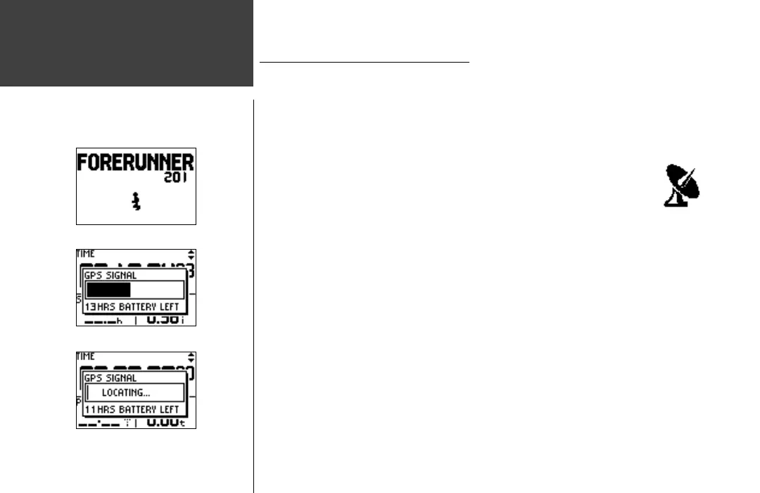 The satellite dish icon on the left side of the screen fl ashes while the Forerunner determines