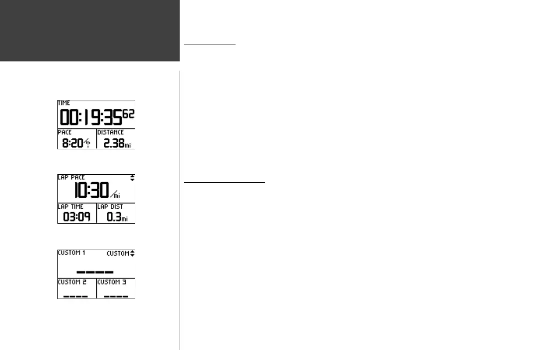 • Press to cycle through the data screens: Time/Pace(Speed)/Distance, Lap Pace(Speed)/Lap