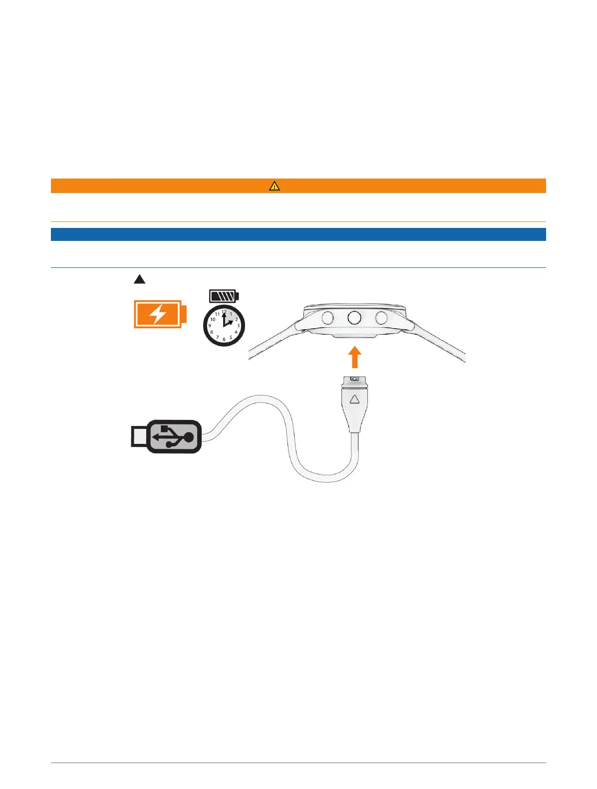 1 Connect the charger securely to the watch to charge it using the USB cable (Charging the Watch, page93).