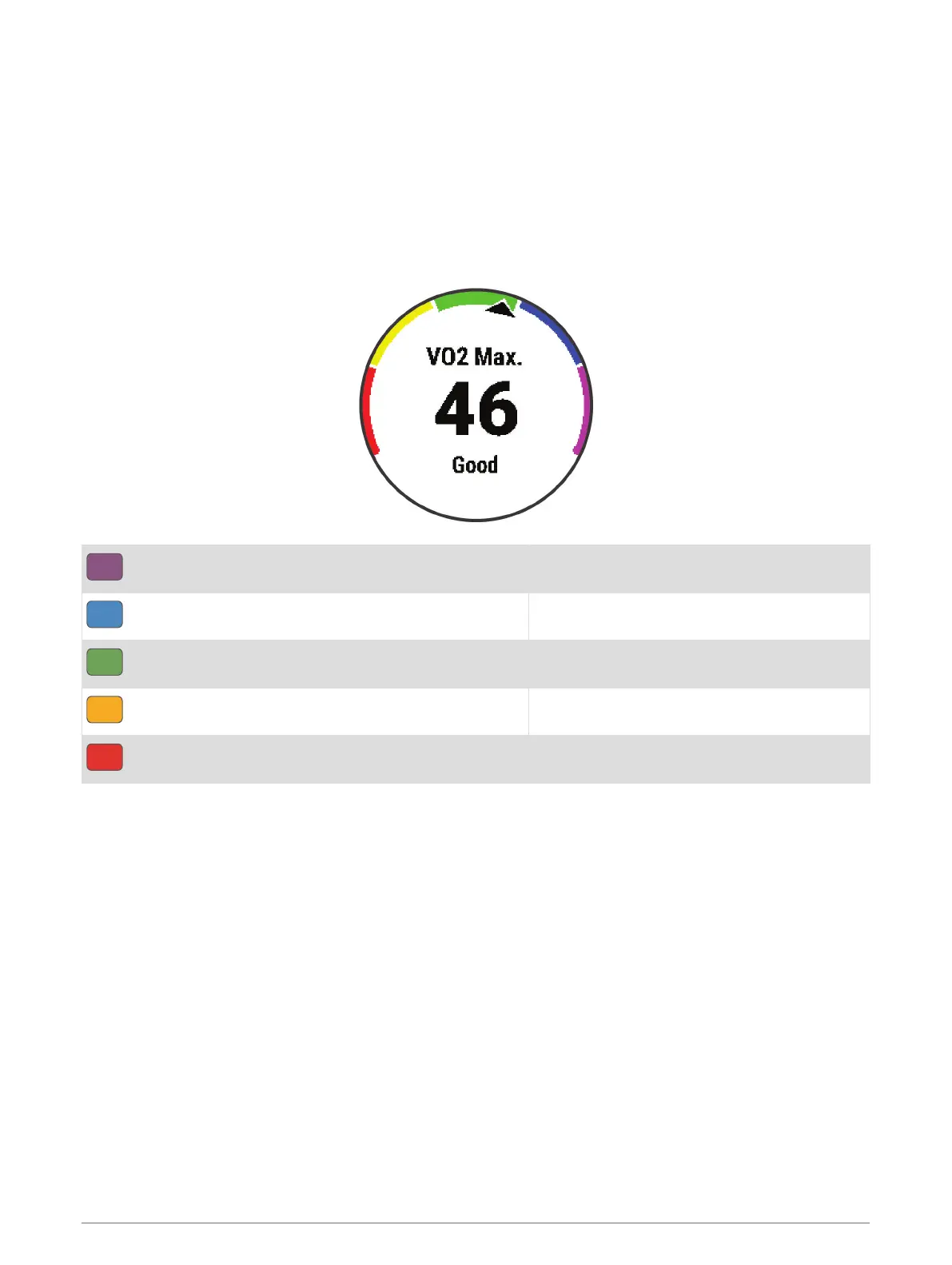On the device, your VO2 max. estimate appears as a number, description, and position on the color gauge. On