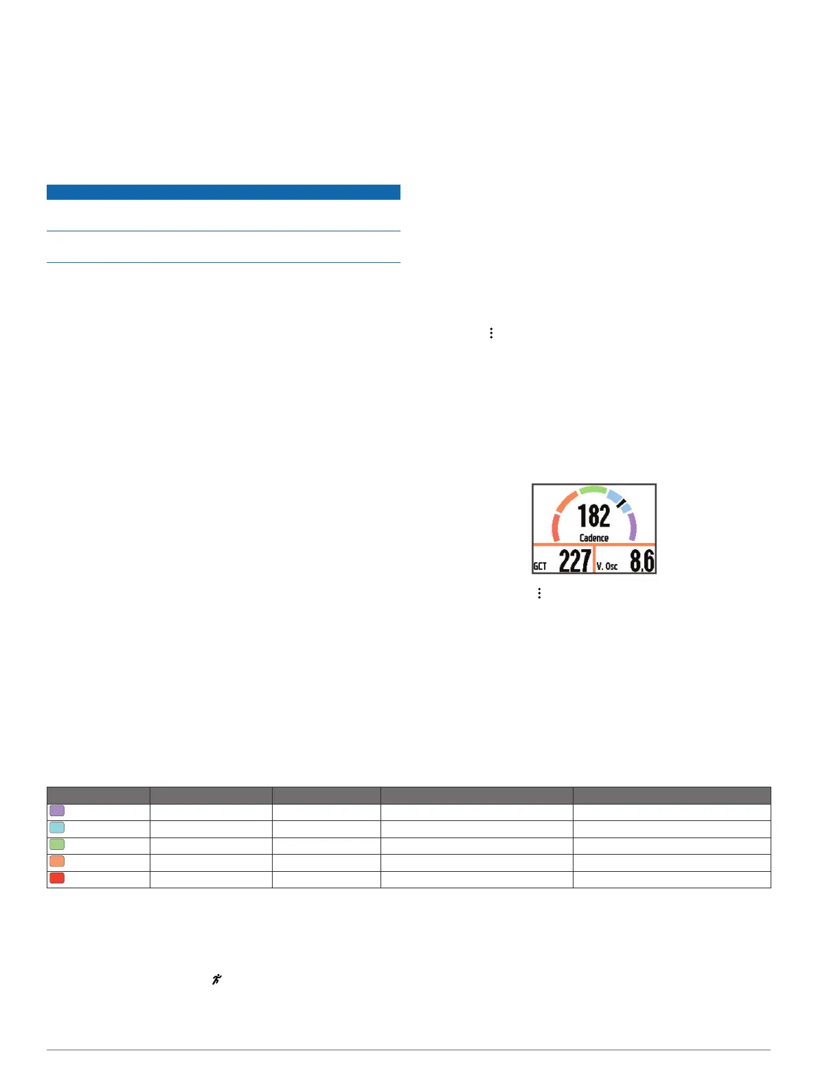 The running dynamics screen displays a color gauge for the primary metric. You can display cadence, vertical oscillation, or ground
