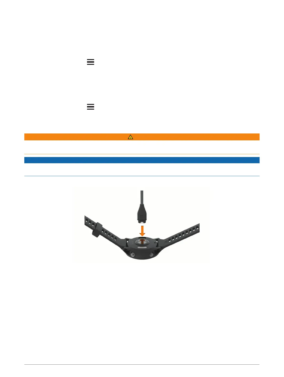 1 Connect the charger securely to the device to charge it using the USB cable (Charging the Device, page 94).