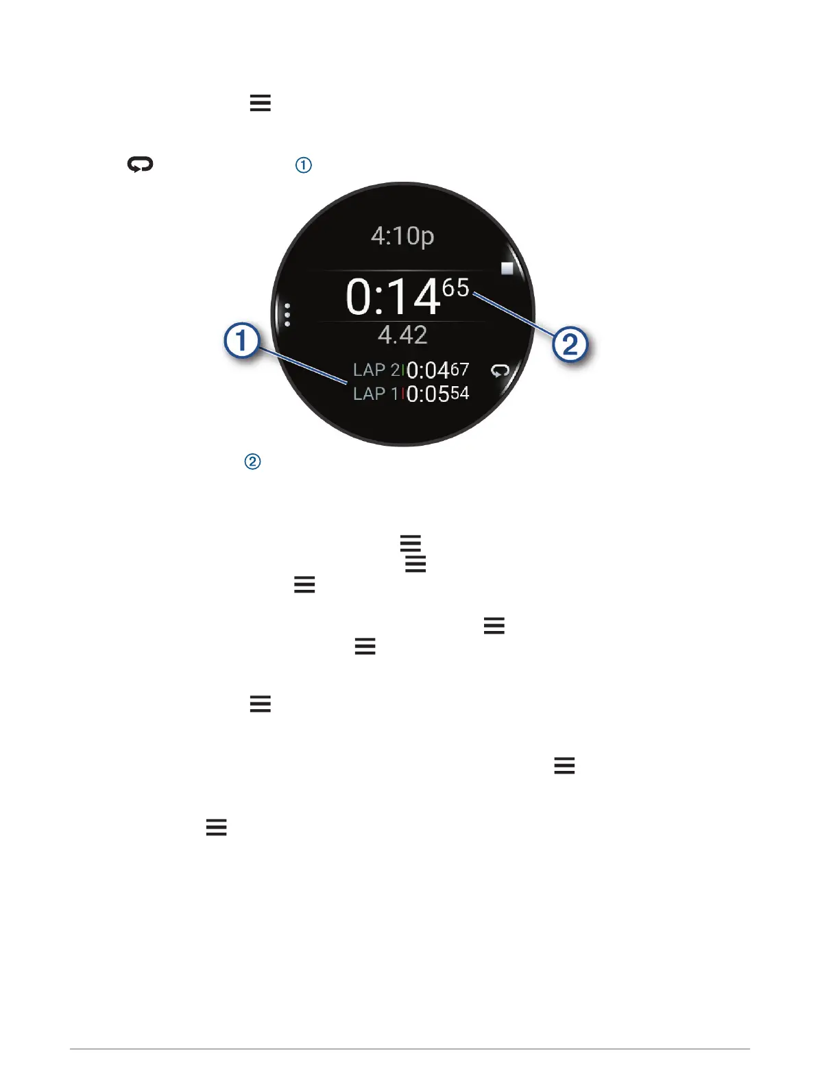 • To return to the watch face without resetting the timers, press , and select Go to Watchface.