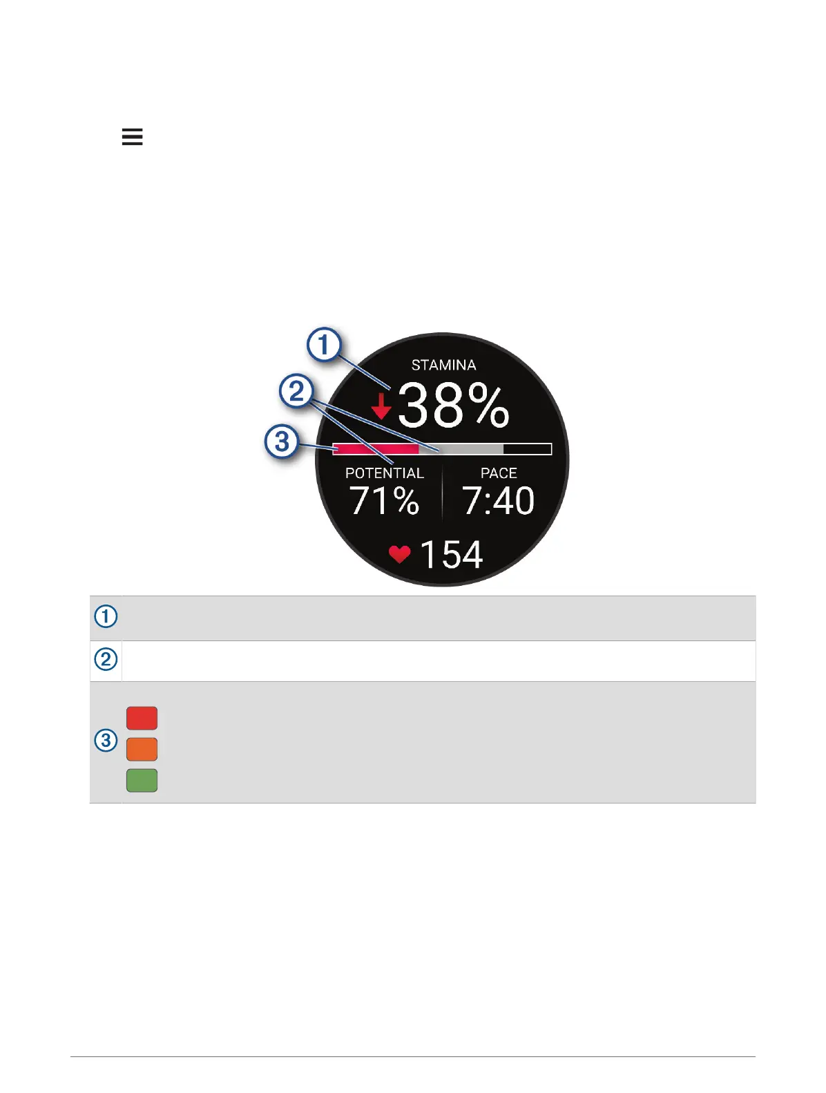 Primary stamina data field. Shows your current stamina percentage, distance remaining, or time