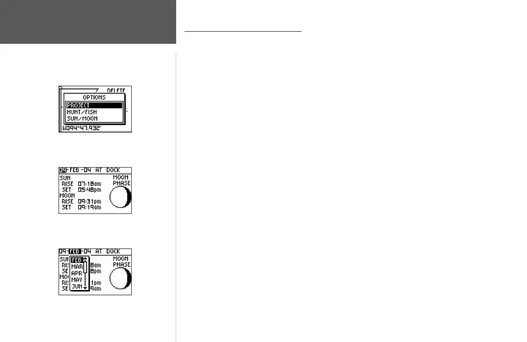 lected waypoint for the current date. A graphic display of the moon phase is also displayed.