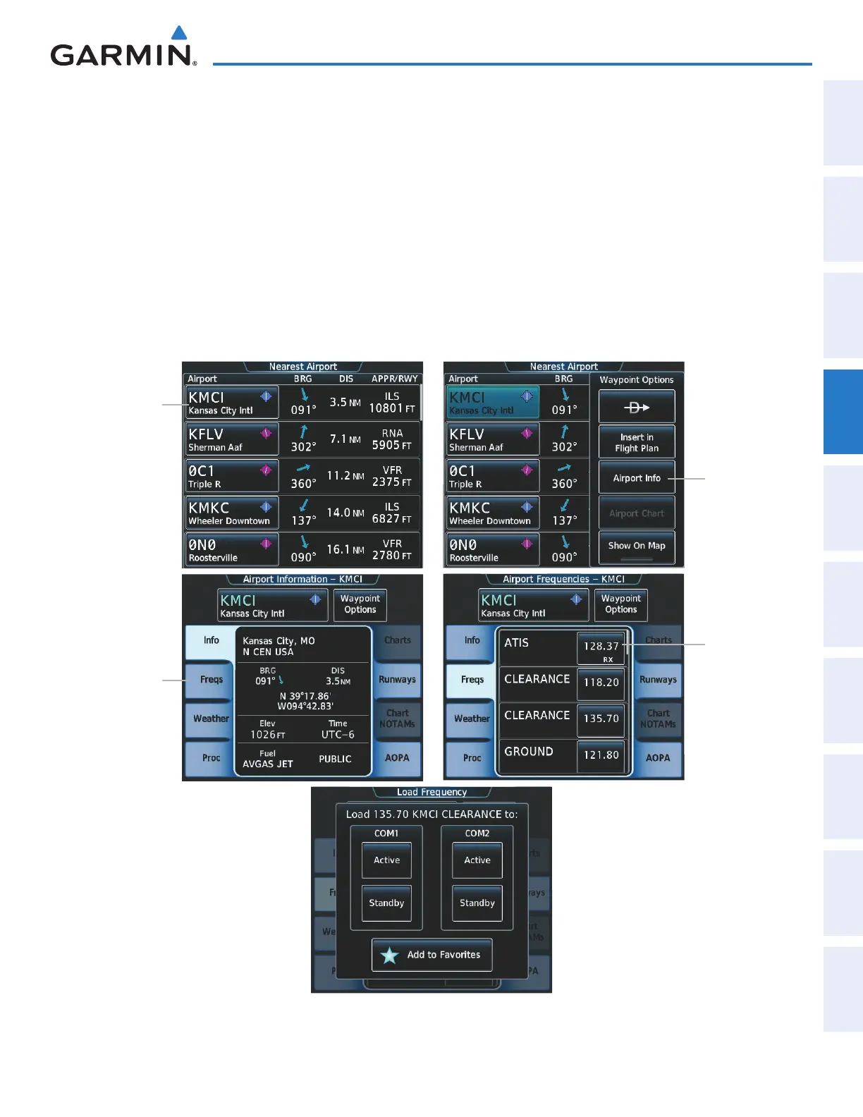 Finding and selecting a COM frequency from the Nearest Airport Screen: