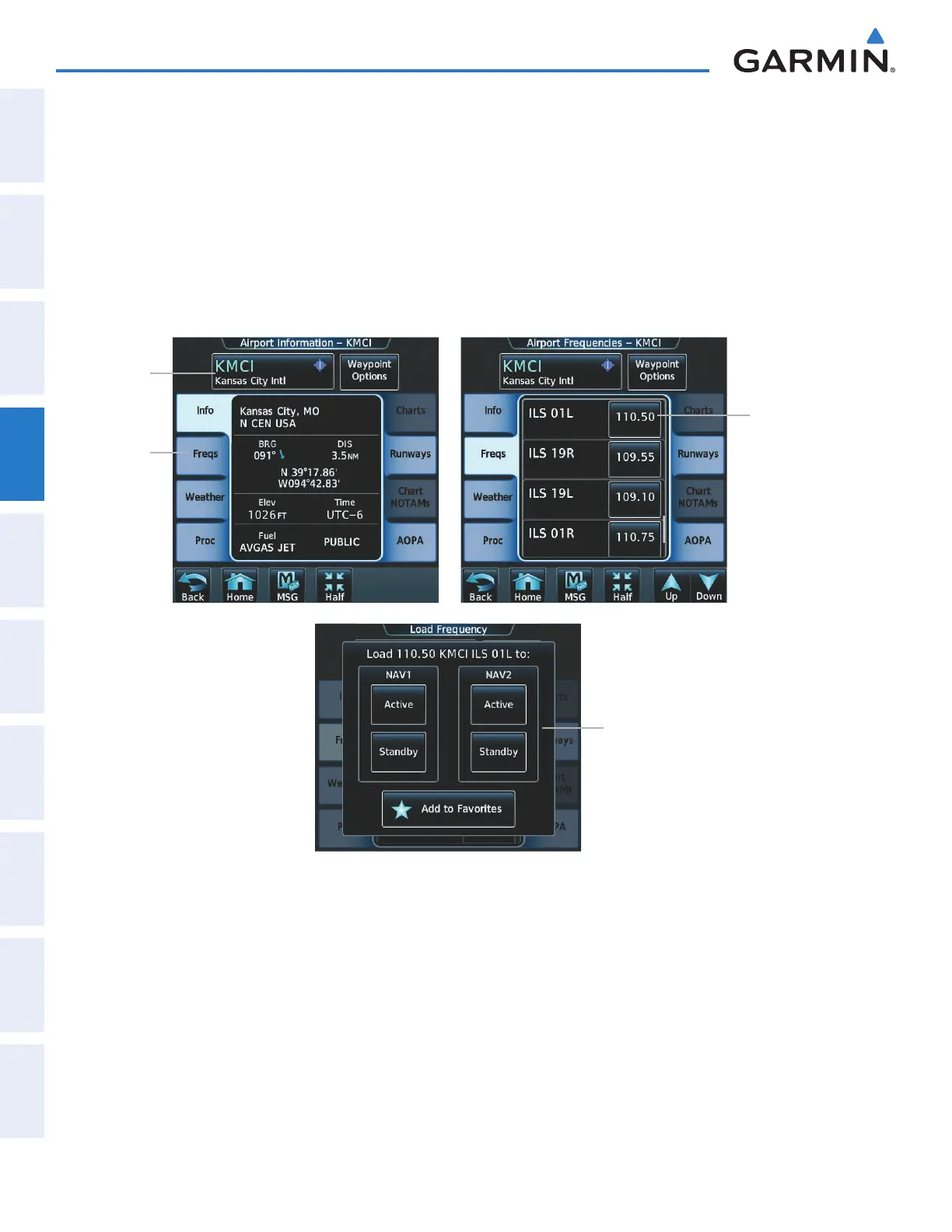 Finding and selecting a NAV frequency from the Airport Info Screen: