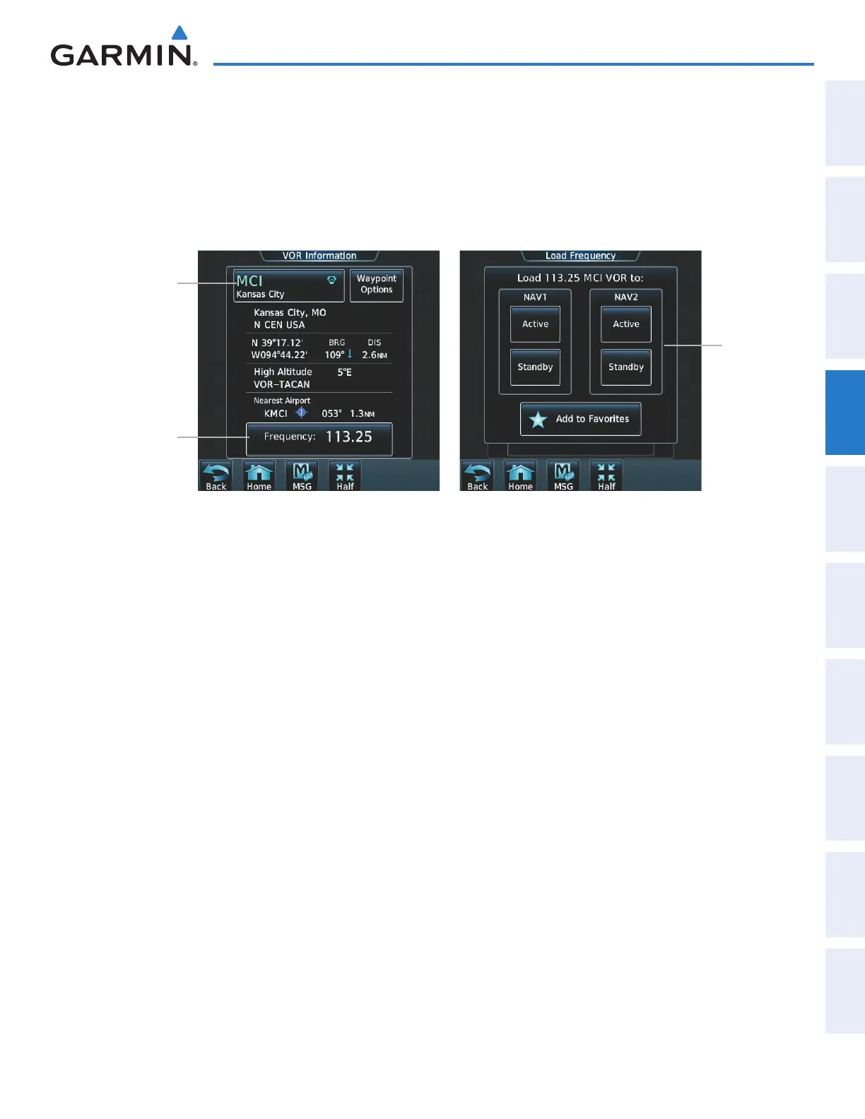 Finding and selecting a NAV frequency from the VOR Info Screen: