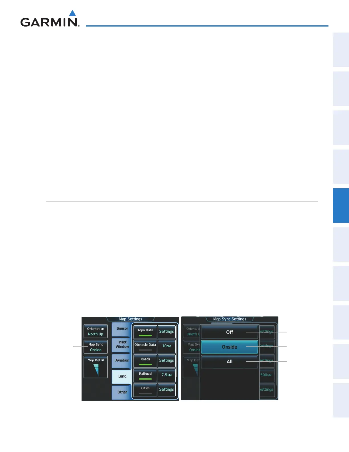 3) Touch the PFD1, MFD Left, PFD2, or MFD Right Button to initially synchronize the onside map settings or all