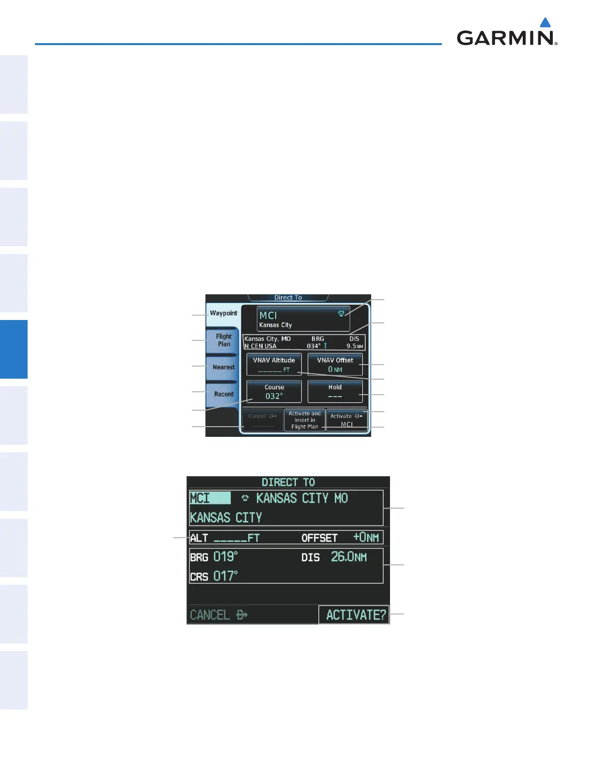 activation of direct-to navigation, and displays selected direct-to waypoint data on the PFD and the Touchscreen