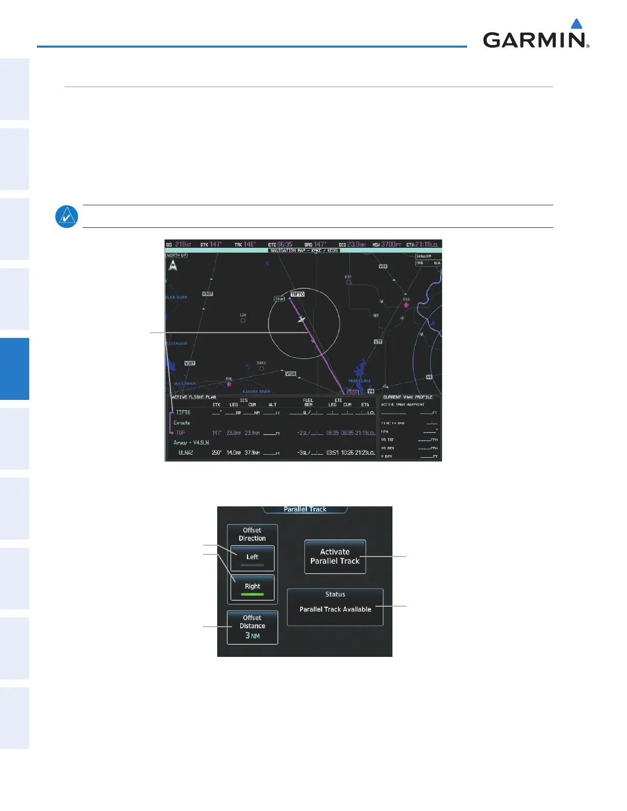 flight plan. When Parallel Track is activated, the course line drawn on the map pages shows the parallel course,