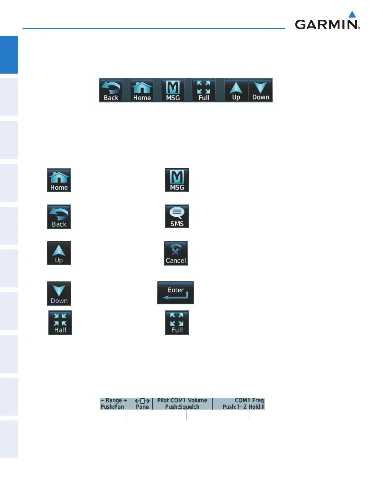 include Map Range adjustment, display pane selection, radio volume/squelch adjustment, COM radio tuning,